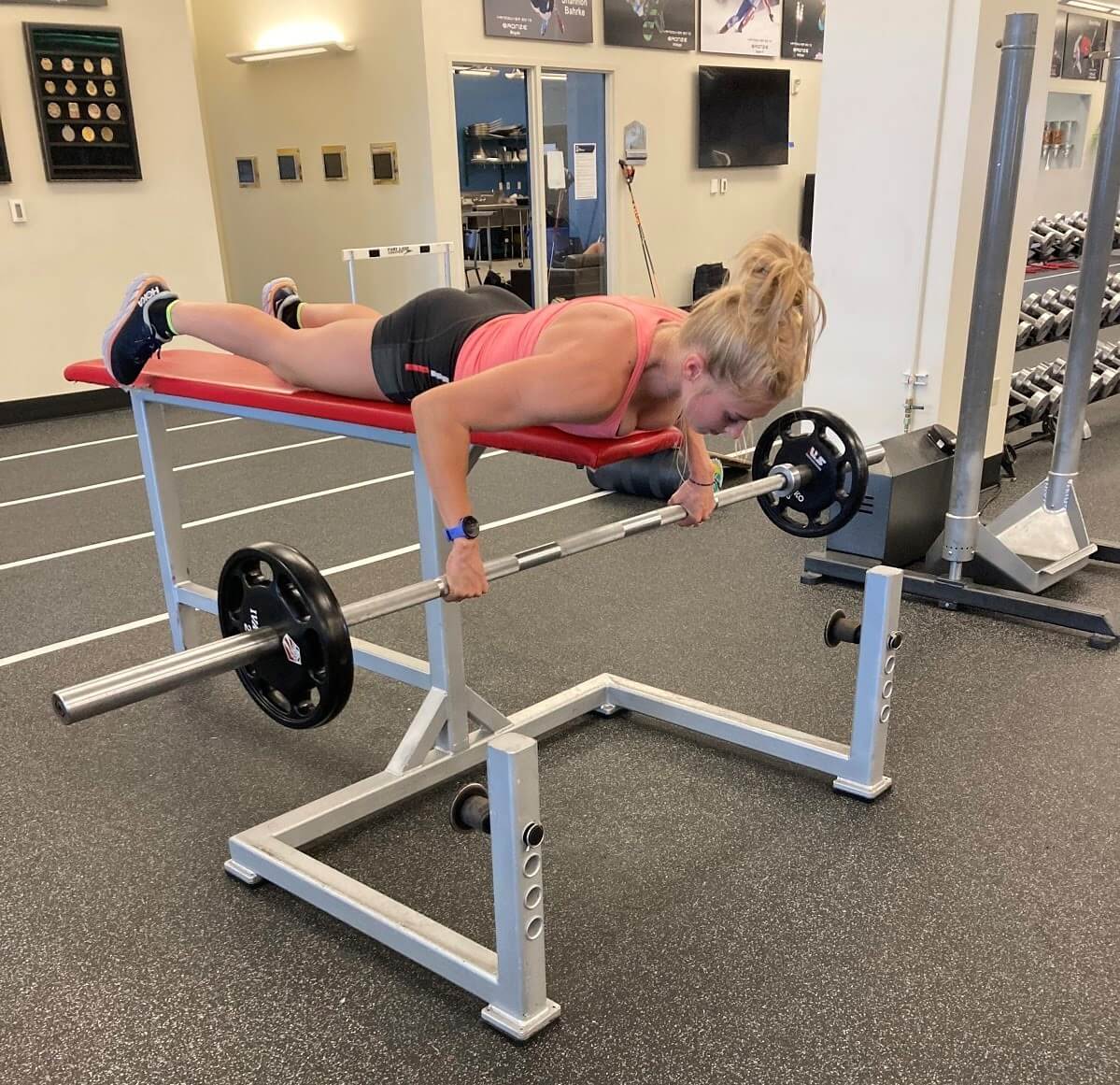 However, after our Friday morning session, the air quality took a turn for the worse due to wildfires in the West. Training outdoors in the smoke can have negative long-term impacts on athletes’ lungs, so we have been limited to training indoors at the Center of Excellence since then. This building has been an amazing resource for us during camp. It has equipment that you’d find in most gyms like spin bikes and lifting racks, but it also has special equipment that is more specific to our sport, such as a roller ski treadmill, which has been extremely useful for us. The limitations brought upon us by the smoke ended up presenting new opportunities to focus more intensely on fine tuning our technique while using the roller ski treadmill and watching a live video of ourselves.